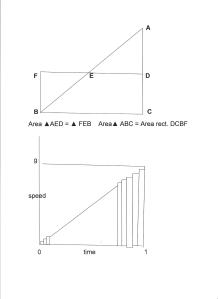 Galileo and one or two of his medieval predecessors resolved the ‘continuous acceleration problem’ by geometricizing it, even it belonged to dynamics, the science of movement, while geometry is the science of the changeless (Euclidian anyway). As we all learned at school the area of a triangle is half the height times the base. But most people have forgotten, if they ever knew, why the formula works. It works because, taking the simplest case, that of a right angled triangle, you can cut off the upper ‘half-triangle’ and bring it round to form a rectangle. And the area of this rectangle is half the original height times the base. (Subsequently, we deal with non right-angled triangles by showing that the area of a parallelogram between the same two parallels is that of the equivalent rectangle.)